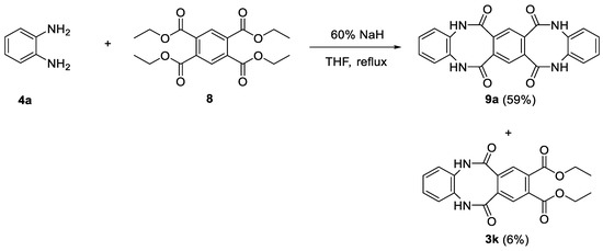 We also investigated the reaction between benzene-1,2-diamine (4a) and tetraethyl benzene-1,2,4,5-tetracarboxylate (8) in a 2:1 ratio and observed the formation of a novel pentacyclic product 9a, possessing a unique scaffold consisting of two diazocine-6,11-dione rings separated by a benzene ring (Scheme 2). Product 9a precipitated out of the reaction mixture after the reaction took place and was separated by filtration under reduced pressure. In the obtained filtrate, we also identified small amounts of the intermediate tricyclic diethyl 6,11-dioxo-5,6,11,12-tetrahydrodibenzo[b,f][1,4]diazocine-8,9-dicarboxylate (3k), which was purified and isolated by column chromatography.