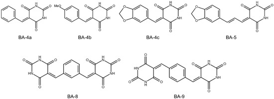 - Yan, Q.; Cao, R.; Yi, W.; Chen, Z.; Wen, H.; Ma, L.; Song, H. Inhibitory effects of 5-benzylidene barbiturate derivatives on mushroom tyrosinase and their antibacterial activities. Eur. J. Med. Chem. 2009, 44, 4235–4243. [Google Scholar] [CrossRef]
