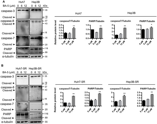 BA-5 treatment activated caspase-7 and PARP cleavage. (A) Parental HCC cells (1.6 × 105/well Hep3B and Huh7) and (B) sorafenib-resistant HCC cells (1.4 × 105/well Hep3B-SR and Huh7-SR) were seeded in 6-well plates and treated with 0, 6, and 12 µM BA-5 for 48 h. The protein expression levels of cleaved caspase-7 and PARP were evaluated by western blot. α-Tubulin served as a loading control. Protein quantification was performed by using Image J software. *, p < 0.05; **, p < 0.01 compared to the black bar.