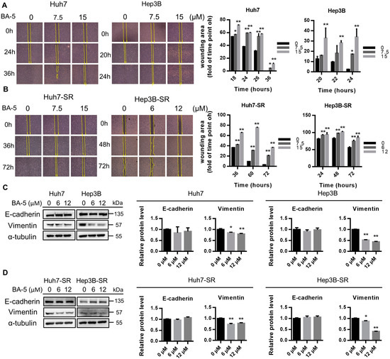 BA-5 treatment reduced the migration ability and Vimentin expression in HCC and HCC-SR cells. (A,B) HCC cells (2.8 × 105/well Hep3B and 3.5 × 104/well Huh7) and HCC-SR cells (2.8 × 105/well Hep3B-SR and 1.75 × 105/well Huh7-SR) were seeded in Ibidi culture inserts and treated with the indicated concentration of BA-5. The images were obtained at the indicated time point and wound areas were calculated by using Image J software and are shown in the column charts. (C,D) Hep3B, Huh7 (1.6 × 105/well), Hep3B-SR and Huh7-SR (1.4 × 105/well) cells were seeded in 6-well plates treated with 0, 6, and 12 µM BA-5 and incubated for 48 h. The protein expression levels of E-cadherin and Vimentin were evaluated by western blot. α-Tubulin served as a loading control. Protein quantification was performed by using Image J software. *, p < 0.05; **, p < 0.01 compared to the black bar.
