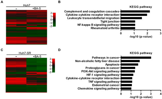 Gene expression profile of BA-5 treated Huh7 and Huh7-SR cells. (A,C) Heat map of differentially expressed genes in BA-5-treated Huh7 and Huh7-SR cells based on mRNA microarray analysis. A significant difference was observed in mRNA expression between the control and BA-5-treated cells. (B,D) Kyoto Encyclopedia of Genes and Genomes (KEGG) pathway enrichment analysis of up and downregulated genes between the control and BA-5-treated cells.