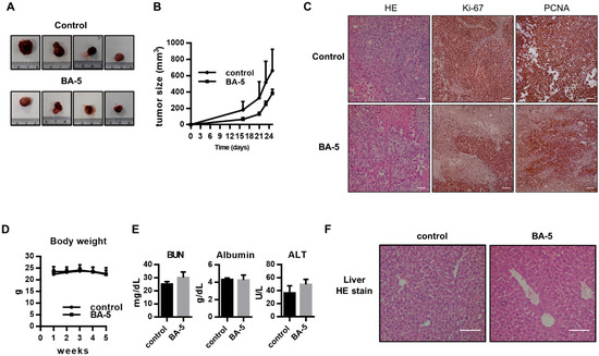 To correlate the in vivo antitumor effects with the mechanism identified in vitro, an HCC xenograft mouse experiment was performed. We observed that BA-5-treated group tumor growth rate was lower than control group, and found tumor size of control group was smaller than that of control group (Figure 7A,B). However, there was no statistical difference between control group and BA-5-treated group. Histologically, the architecture of the tumor sections indeed resembled human HCC cell morphology, as demonstrated by H&E staining (Figure 7C). In addition, tumor sections in the BA-5-treated group had lower expression the proliferative biomarkers Ki-67 and PCNA than those in the control group (Figure 7C). These data implied that treatment with BA-5 inhibited tumor growth in the mouse model. To assess the side effects of BA-5 treatment, the body weight and serum levels of BUN, ALT, and albumin were analyzed. The results showed that there was no statistically significant difference between the BA-5-treated and BA-5-untreated groups (Figure 7D,E). In addition, liver sections from the BA-5 group showed regular arrangement compared with the control group (Figure 7F). These results suggested that BA-5 possessed antitumor ability and without any visible in vivo side effects.