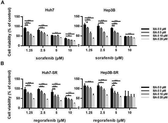 Treatment with combined BA-5 and sorafenib/regorafenib inhibited HCC and HCC-SR cell viability. (A) Huh7 and Hep3B cells (3 × 104/well) were seeded in 96-well plates. After 48 h of treatment with BA-5 (0–20 µM) and sorafenib (1.25–10 µM), cell viability was detected by using an MTT assay. (B) Huh7-SR and Hep3B-SR cells (2.5 × 104/well) were seeded in 96-well plates. After 48 h of treatment with BA-5 (0–20 µM) and regorafenib (1.25–10 µM), cell viability was detected by using an MTT assay. *, p < 0.05; **, p < 0.01.
