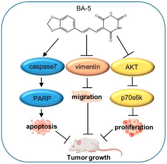Hepatocellular carcinoma accounts for 70–80% of liver cancer cases and is the third leading cause of cancer-related death [2]. Sorafenib is a standard first-line targeted drug approved for advanced HCC patients. However, the drug resistance hampers the use of sorafenib. The underlying mechanism of sorafenib resistance is complex, and its exact cause is still elusive [31]. Although sorafenib inhibits diverse kinases, a genetic investigation called attention to the compensatory activation of the AKT signaling pathway in the development of HCC, which might be a potential mechanism of acquired sorafenib resistance [32]. Reports have illustrated that sorafenib has limited benefit for 30% of patients [13]. In addition, erlotinib combined with sorafenib showed no significant difference in the survival rate compared to sorafenib alone in a clinical phase III trial [33]. Because sorafenib is expensive and has a low response rate, it is important to develop new drugs to treat HCC. In our study, we investigated the effect of a series of barbituric acid derivatives, among which BA-5 displayed more potent activity. In vitro experiments showed that BA-5 significantly inhibited HCC and HCC-SR cell viability, enhanced the apoptosis pathway, and suppressed migration activity. In the in vivo experiment, treatment with BA-5 reduced tumor growth in mice (Figure 9).
