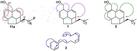 Key HMBC (→) correlations for compounds 11a, 1, 2, and 3.