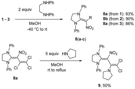 Imidazolidines 8 have been prepared by reaction of nitrodienes 1–3 with N1, N2-diphenylethane-1,2-diamine in methanol. Under optimized conditions, yields of the products 8 reached 86–93% (Scheme 3). Only compound 8a was previously prepared [11] and isolated in 25% yield by reaction of (1,3,4,4-tetrachloro-2-nitrobuta-1,3-dien-1-yl)(p-tolyl)sulfane with N1,N2-diphenylethane-1,2-di-amine. Treatment of imidazolidine 8a with a fivefold excess of pyrrolidine in refluxing methanol led to the formation of a SNVin product, the 2-(3,3-dichloro-1-nitro-2-(pyrrolidin-1-yl)allylidene)-1,3-diphenylimidazolidine (9) in 50% yield.