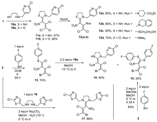 The imidazolidine Imidacloprid (N-{1-[(6-chloro-3-pyridyl)methyl]-4,5-dihydroimidazol-2-yl}-nitramide) has been the most widely used systemic insecticide worldwide. A first synthesis of ana-logues from nitropolychloroalkenes has been reported [12,13], new types of derivatives are presented here. For instance, 11a and 11b were obtained from nitrodiene 1 and chloropyridines 10a and 10b, respectively [13]. Reaction of imidazolidine 11a with a 2.5-fold excess of N-nucleophiles such as ethyl piperidine-4-carboxylate and 1,2,3,4-tetrahydroisoquinoline in methanol at 35–50 °C leads to compounds 12a and 12b in 60–85% yield, respectively. By using 2-mercaptoethan-1-ol as S-nucleophile for the reaction with 11a in the presence of sodium ethanolate, the corresponding sulfane 12c was obtained in 63% yield. Treatment of 11b with a fivefold excess of dimethylamine at rt led to the formation of oxazolidine 12d (70%). By the reaction of bromonitrodiene 2 with an equimolar amount of 4-fluorobenzenethiol in DCM at rt, sulfane 13 was obtained as mixture of two isomers in a total yield of 74%. The subsequent vinylic substitution of the monothio compound 13 by means of 10a gave imidazolidine 14 (44%) as well as ketene dithioacetal 15 (30% yield). Arylthiols are known to be both, good nucleophiles as well as good leaving groups. Compound 14 was previously syn-thesized in 40% yield directly from nitrodiene 2 and diamine 10a [12]. 1,1-Dithio compound 15 could be obtained in 83% yield from diene 2 and two equivalents of 4-fluorobenzenethiol using sodium methanolate as a base. The reaction of diene 2 with diamine 16 [13] at optimized conditions furnished the imidazolidine 17 as a mixture of two isomers in a total yield of 89% (Scheme 4).