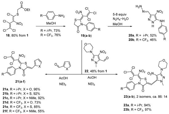Thiazolidin-4-ones represent a class of compounds that has proven to exhibit distinctive bio-activity, e.g. antifungal, antibacterial, antitubercular, and anticonvulsant properties [14,15,16,17]. Our research in this area is presented through an efficient synthesis of functionalized (Z)-2-allylidene-thiazolidin-4-ones [18]. Nitrodiene 1 reacts with ethyl 2-mercaptoacetate to give the sulfane 18 as single E-isomer [19]. For the subsequent reactions of sulfane 18, we used two aniline derivatives, an activated (ERG) and an desactivated (EWG) one. In both cases, the expected thiazolidinones 19a,b were obtained in good yields (73–76%). Treatment of 19a,b with a 5– to 8–fold excess of hydrazine led to pyrazoles 20a,b. The assumed mechanism for this ring-opening and subsequent ring-closure transformation forming 20a,b has been presented [18]. Heating of thiazolidinones 19a,b with five membered 2-formyl heterocycles in acetic acid in the presence of trimethylamine furnished hetarylmethylidenethiazolidinones 21a,f in good to excellent yields, as single diastereomers. The Z-configuration was assigned according to literature data. The presence of only one signal for the methylidene proton at 7.72–8.15 ppm in the 1H nmr spectra of compounds 21a,f suggested the formation of a single isomer, which was assigned to the Z-configuration according to the literature for similar compounds [20,21]. Interestingly, close analogues of these structures, i.e., the 5-arylmethylidene rhodanines, possess photosynthesis-inhibiting and antialgae properties [22], show anticancer activity [23,24], and are inhibitors of bacterial enzyme synthetase MurD with E. coli [25].