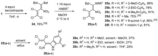 Functionally substituted benzazetines have also been made accessible starting from 1 [27]. The derived bis(benzotriazole) 24 was obtained in 76% yield according to the literature [28]. Single amine exchange of azole 24 is feasible with aromatic, aliphatic, and heteroaromatic amines in methanol at mild reactions conditions and led to 1-benzotriazolyl-1-(organylamino)-2-nitro-3,4,4-trichloro-1,3-butadienes 25a–f in good yields (75–91%). Dienes 25d and 25e have been described, already [26,29]. Heating of nitrodienes 25a–c in different solvents (MeOH for 26a, EtOH for 26b, and THF for 26c) gave the corresponding benzazetines 26a–c in 25-37% yield (Scheme 6). No reaction occurred in diethyl ether, while in benzene, strong tarring was observed [30]. Some details on the synthesis and chemical transformations of benzazetines have been published, already [30]. N-Unsubstituted derivatives are unstable. Stable substituted representatives have become accessible for the first time in recent years. The substructure of a ß-nitro-substituted enamine within compounds 26a–c should enable a stabilization caused by a strong hydrogen bond between an oxygen atom of the nitro group and the single proton at the azetine nitrogen atom. The wide-ranging synthetic possibilities of benzazetines and benzazetes have also been discussed.