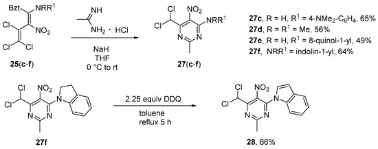In the course of the studies concerning polyhalogenated nitrobutadienes, a new ring closure approach to perfunctionalized 5-nitropyrimidines was also developed [33]. Using this protocol starting from 25c–f, four new nitropyrimidines 27c–f were obtained. Even under optimum conditions, yields of the products 27c–f remained moderate, reaching 49–65%. The assumed mechanism for the formation of pyrimidines 27 has been presented in the literature [33]. 5-Nitro-substituted pyrimidines are interesting precursors for the synthesis of a wide range of poly-substituted pyrimidines and other heterocyclic systems with potential biological activity [34]. Among numerous applications, some examples are noteworthy: cytotoxic activity is documented [35,36] as well as the potential to inactivate the human DNA repair process [37]. The broad variety of medicinal applications is further illustrated, e.g. with the activity against chronic obstructive pulmonary disease [38], applicability against herpes simplex [39], and other viral diseases [40]. Furthermore, one field of application of 5-nitropyrimidines uses their positive modulating effect of the GABAB receptor [41,42]. Pyrimidin-4-yl-1H-indoles are a very rare class of organic compounds; to the best of our knowledge, only 4 representatives are known till today [43,44,45]. With the aim to synthesize a new pyrimidin-4-yl-1H-indole with potent biological activity, we made an attempt to oxidize the 2,3-dihydroindole 27f. Indeed, by using DDQ as oxidizing agent (ratio 27f: DDQ 1: 2.25, toluene, reflux 5 h), the expected indole 28 was obtained in 66% yield (Scheme 7).