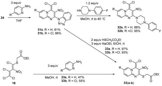 Recently, a new pathway for the synthesis of 4-(dichloromethylene)-3-nitro-4H-pyrido[1,2-a]pyrimidines with a unique substitution pattern at the pyrimidine ring was developed [28]. Starting with bis(benzotriazole) 24, using a threefold excess of 2-aminopyridines two enamines 31a,b were formed in THF in 81–86% yield. The benzotriazole unit in pyridopyrimidines 31, activated through the neighboring nitro group, acts as a very good leaving group and can be replaced with different nucleophiles at mild reaction conditions. Thus, treatment of compounds 31 with 1-(4-fluoro-phenyl)piperazine in methanol at 40 °C led to the piperazino-substituted pyridopyrimidines 32 in excellent yields. A SNVin process in pyridopyrimidines 31 under action of S-nucleophiles such as ethyl 2-mercaptoacetate using sodium ethanolate as base furnished sulfane 33a,b in 93–97% yield. Another possibility to form compounds 33a,b is reaction of sulfane 18 with 2-aminopyridines. At optimum conditions (MeOH, threefold excess of amino-pyridines, rt), the yields of pyridopyrimidines 33 reached 47–55% (Scheme 9). Similar pyrido[1,2-a]pyrimidines show antiviral [55], antithrombotic [56], and antibacterial [57,58,59,60] activities.