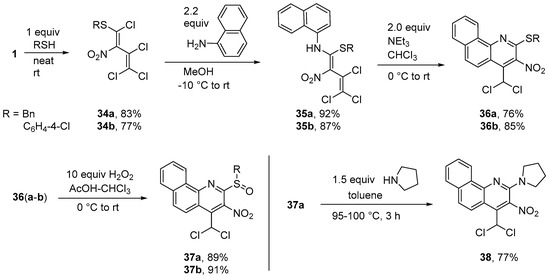 In the course of our studies on polyhalogenated nitrobutadienes, a new ring closure approach to benzo[h]quinolines was also developed [61]. Starting from nitrodiene 1 in three steps, the target benzo[h]quinolines with a unique substitution pattern at the pyridine ring were obtained in good yields. In detail, after mono substitution of one chlorine group in diene 1 sulfanes 34a,b were formed as single isomers each in yields of about 80% according to the literature [62] for the benzyl derivative 34a and literature [9] for the 4-chlorophenyl derivative 34b. In a second step, we synthesized the aminothiobutadienes 35a,b by interaction of sulfane 34a,b with an excess of 1-naphthylamine in methanol at −10 °C to rt. Dienes 35a,b were also formed (76–85% yield) as single E–isomers due to the stable six membered hydrogen bridge between the amino and nitro group. Finally, the ring closure at optimum conditions (twofold excess of triethylamine as a base) proceeded under formation of the expected benzo[h]quinolines 36a,b in good yields (76–85%). The assumed mechanism for the formation of benzo[h]quinolines is depicted in the literature [61]. Benzo[h]quinolines are a precious class of organic compounds and show interesting biological properties [63,64,65,66,67]. Oxidation of quinolines 36a,b with excess of hydrogen peroxide in a mixture of acetic acid and chloroform lead to the formation of sulfoxides 37a,b in 89–91% yield. The sulfinyl group is known to be a good leaving group [68,69,70]. Indeed, treatment of sulfoxide 37a with an excess of pyrrolidine in toluene at 100 °C furnished amino derivative 38 in 77% yield (Scheme 10).