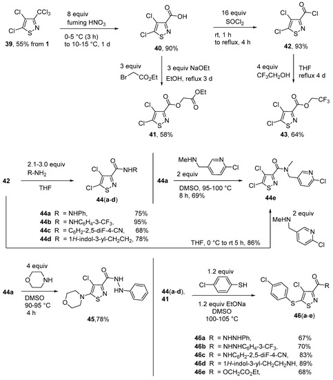 The isothiazole 39 was obtained from nitrodiene 1 upon treatment with elemental sulfur at 200 °C [71]. Subsequent reaction with fuming nitric acid provided the 4,5-dichloroisothiazole-3-carboxylic acid (40) [72], which could be easily converted into the corresponding acid chloride 42 with thionyl chloride (93% yield) [28]. Acid 40 reacts with ethyl 2-bromoacetate in the presence of sodium ethanolate under reflux conditions to ester 41 in 58% yield. The esterification of acid chloride 42 with a fourfold excess of 2,2,2-trifluoroethan-1-ol in refluxing THF resulted in the formation of a 2,2,2-trifluoroethyl 4,5-dichloroisothiazole-3-carboxylate (43) (64% yield). Acid chloride 42 smoothly reacted with aromatic and aliphatic amines to provide the corresponding amides 44a–d in 68–95% yield. The reaction of chloride 42 with 2 equivalents of 1-(6-chloropyridin-3-yl)-N-methyl-methanamine in THF furnished amide 44e as mixture of two rotamers in relation 10: 6 with a total yield of 86%. An alternative way to obtain amide 44e is the interaction of carbohydrazide 44a with 1-(6-chloropyridin-3-yl)-N-methylmethanamine at harder reactions conditions (DMSO, 95–100 °C). In this case, amide 44e is formed as a mixture of two rotamers (relation 10:6), with a total yield of 69%. Reacting hydrazide 44a with a fourfold excess of morpholine (DMSO, 90–95 °C) did not lead to the formation of a product similar to amide 44e. Instead, upon substitution of a chlorine group in 5 position of the heterocyclic ring, an isothiazole 45 was formed (78% yield). These amides 44a–e and 45 are interesting candidates for biological testing, as amides of 4-chloroisothiazol-3-carboxylic acid have been shown to exhibit high antibacterial activity [73,74,75]. Finally, we investigated the interaction of amides 44a–d and ester 41 with S–nucleophiles such as 4-chlorobenzenethiol. In all cases, reaction products at 5 position of the heterocyclic ring were formed. Under optimized reaction conditions, the yields of the 5-((4-chlorophenyl)thio)isothiazoles 46a–e were in the range of 67–89% (Scheme 11).