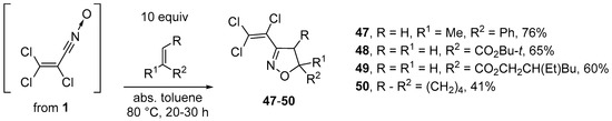 Recently, we developed a novel, fairly general method for the synthesis of dihydroisoxazoles with a chlorinated side chain in 3-position, starting from gem-dichloronitroalkenes [76]. In particular, reaction of nitrodiene 1 with a base leads to the formation of 2,3,3-trichloroprop-2-enenitrile oxide. Trapping of this nitrile oxide with an alkene resulted in 4,5-dihydroisoxazole derivatives 47–50, due to a 1,3-dipolar cycloaddition. In detail, reaction of nitrodiene 1 with prop-1-en-2-ylbenzene at optimized conditions furnished 4,5-dihydroisoxazole 47 in 76% yield. The interaction of the acrylonitrile oxide 1 with tert-butyl acrylate and 2-ethylhexyl acrylate at similar reactions conditions provided alkyl 3-(1,2,2-trichlorovinyl)-4,5-dihydroisoxazole-5-carboxylates 48 and 49 (65 and 60% yield). Upon treatment of diene 1 with cyclohexene, the hexahydrobenzo-[d]isoxazole 50 was isolated in 41% yield (Scheme 12). The yields of 47–49 are quite similar to certain compounds in [76], whereas for 50 (in analogy to the reaction with cyclopentene [76]), the yield is lower as expected. 4,5-Dihydroisoxazoles were found to exhibit potent cytotoxic, antineoplastic [77], and antimalarial activity [78]. Additionally, they can be used as androgenic or antiandrogenic agents or androgen receptor modulators [79] and show antibacterial and antifungal activities [80].
