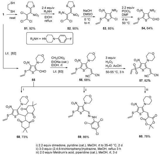 The next successive steps were performed with the most stable derivative 3-morpholino-4-nitro-5-(vinylthio)thiophene-2-carbaldehyde (55) [82]. Knoevenagel condensation of thiophene 55 with malononitrile in ethanol in the presence of a catalytic amount of sodium ethanolate gave the gem-dicyanovinylthiophene 56 in 68% yield [83]. Oxidation of the vinylsulfanylthiophene 56 with threefold excess of hydrogen peroxide in acetic acid at 50–55 °C furnished sulfone 57 in 82% yield. Interaction of carbaldehyde 55 with an excess of dimedone, (2,4,6-trichlorophenyl)hydrazine and Meldrum’s acid in methanol led to the formation of bis(5,5-dimethylcyclohexane-1,3-dione) 58, vinylsulfanyl-thiophene 59 and 1,3-dioxane-4,6-dione 60, respectively (Scheme 13).