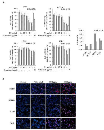 (A) PN suppressive effect on KRAS-mutated colorectal cancer cells of SW480 (KRASG12V) and HCT116 (KRASG13D), and KRAS-wild types CRCs of HCT116 and WiDr. Cells were treated for 48 and 72 h under PN treatment (0, 0.1, 0.5, 1, 2 and 4 µg/mL) and Cetuximab (30 µg/mL). IC50 values are calculated. Results are presented as means ± S.D. of three independent experiments. * p < 0.05, ** p < 0.01, *** p < 0.001. (B) Representative colorectal cancer cell images under PN treatment (0, 0.5, 1 and 4 µg/mL). Blue represents the DAPI-stained cell nuclei, and the propidium iodide-stained dead cells are red. Scale bar = 500 μm. DAPI, 4′,6-diamidino-2-phenylindole; PI, propidium iodide.