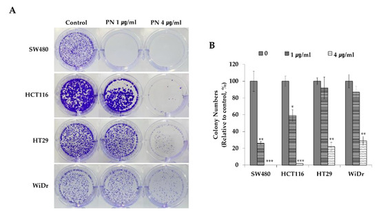 Human CRC cell lines were seeded at 1 × 103 cell/well onto six-well plates. After cells had completely attached, they were treated with 1 or 4 µg/mL of PN, and 10 days later, fixed with 4% paraformaldehyde for 10 min, dried, and stained with 0.05% crystal violet (Sigma) for 15 min. The experiments were performed in triplicate.