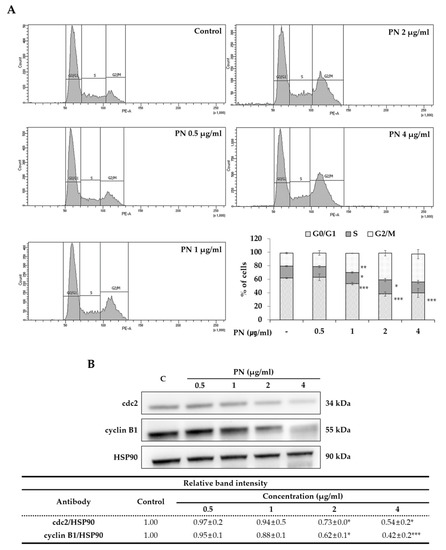 Cell cycle is progressed into four phases: gap1 (G1), DNA synthesis (S), gap2 (G2) and mitosis (M). Arresting cancer cells at a certain stage are often viewed as therapeutic targets [30]. The cell cycle after exposing SW480 cells at concentrations of 0.5–4 µg/mL of PN was investigated. As seen in Figure 4A, cell cycle analysis showed PN concentration-dependently induced accumulation in the G2/M phase and a concomitant reduction in the G0/G1 phase. For example, the proportions of cells in the G2/M phase after treatment with 1 or 4 µg/mL of PN were 28.5 ± 0.3 % and 41.2 ± 6.7 %, respectively, which demonstrated PN inhibited cell growth by arresting cells in the G2/M phase. Then, we investigated expression levels of the cdc2 and cyclin B1, which are proteins for cell cycle progression from G2/M to G0/G1. Indeed, western blot images revealed that PN concentration-dependently reduced the levels of both proteins (Figure 4B).