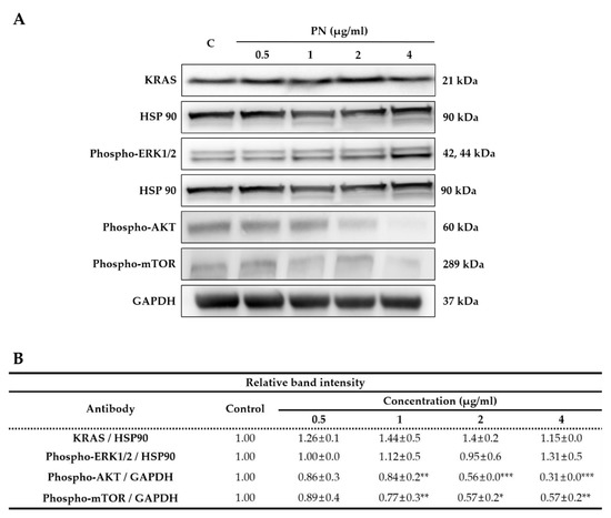 Mutated KRAS-driven CRC signals are through the ERK/MEK or AKT/mTOR pathways [3,4]. During mutated KRAS-driven CRC progression, mutant RAS constitutively activates ERK/MEK or AKT/mTOR phosphorylation, and as a result promotes cancer cell proliferation. To determine whether SW480 growth inhibition by PN is regulated by RAS/ERK or AKT/mTOR pathways, cells are treated with PN for 48 h and protein levels of KRAS, p-ERK, p-AKT, and p-mTOR were assessed by western blot. As shown in Figure 5, PN significantly and concentration-dependently suppressed p-AKT and p-mTOR phosphorylation. For example, the expression of p-AKT was reduced to 0.31 in PN 4 µg/mL treated cells as compared with 1.0 in the non-treated control. The level of KRAS and ERK phosphorylation was similar in all groups as observed in Figure 5. These results demonstrated that PN suppressed CRC progression predominantly via the AKT/mTOR pathway. The AKT/mTOR and ERK/MEK pathways are known to be major regulatory signaling pathways that relate to CRC cell proliferation, metabolism, and survival [2,4,33]. Our observations suggest that the antitumor effect of PN is caused by reductions in the phosphorylations of AKT and mTOR.