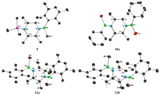 Molecular structures of 9, 10a, and 11 in the solid state (ellipsoids set at 50% probability). Hydrogen atoms, except for the C(sp3)–H and the olefinic H in 11a and 11b, are omitted for clarity. Selected bond lengths (Å) and angles (°) for 9: B1–N1 1.376(7), N1–C1 1.451(6), C1–C2 1.343(7), N2–C2 1.434(6), N2–Si1 1.759(5), C2–C1–N1 115.3(4), C1–N1–C1* 111.1(4); for 10a: B1–N1 1.401(2), N1–C2 1.4494(17), C1–C2 1.328(2), N1–C1* 1.4513(18), C1–C2–N1 116.25(12), C2–N1–C1* 110.63(11).