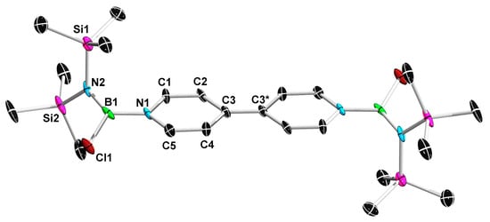 The reaction of (SiMe3)2NBCl2 with 12 [38] of greater reducing power (redox potential of −0.40 V) [39] was performed at ambient temperature in C6D6. After the removal of the solvent and extraction with hexane, an NMR spectroscopically pure product 13 was obtained with a yield of 75%. Compound 13 was confirmed by NMR spectroscopic (Figures S29–S31) and HRMS studies. Suitable single crystals of 13a for X-ray diffraction analysis were obtained upon storage of the reaction mixture overnight at RT (Figure 3 and Figure S41). The N1–C1/N1–C5 (1.402(8)–1.414(8) Å), C1–C2/C5–C4 (1.332(8)–1.347(9) Å), C2–C3/C3–C4 (1.444(9)–1.452(9) Å), C3–C3* (1.376(12) Å) distances are in line with the Lewis structure depicted in Scheme 3.