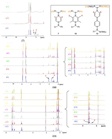 Apparently, both the RT-NMR spectroscopic and crystallographic studies failed to prove any successful reduction of the trivalent borane to divalent boron radical. Since the rotational barrier around an N―B dative bond should be lower than that of a B=N double bond, we assumed that any contribution from the bonding mode B (Scheme 1) should slightly lower the rotational barrier around the exocyclic B–N bond. In this context, we conducted a variable-temperature 1H-NMR experiment to provide further insight. Toluene-d8 was selected as the solvent with a temperature ranging from −60 °C to 80 °C. In general, the exocyclic H or Me as marked in Figure 4 (top right) should display two signals if the B=N bond is nonrotatable. The separated signals will coalesce at an elevated temperature when the B–N bond overcomes the rotational barrier and begins to rotate. Determination of the separation (Hz) of two signals and the coalescent temperature allows calculation of the B–N rotational barrier. The results of the VT-NMR experiments and assignment of the signals of interest are depicted in Figure 4 and Figures S32–S36. The obtained ΔG≠ values are summarized in Table 1. Analysis of the VT-NMR spectra revealed 7 with a strong B=N bond, and 10 and 13 with weak B=N bonds, as reflected by their rotational barriers >71.56 kJ/mol (7), 58.79 kJ/mol (10), 58.65 kJ/mol (13) when compared with ordinary B=N double bonds (71–100 kJ/mol) [40]. When taking the aforementioned assumption into account, the remarkably lower B–N rotational barrier of 10 compared to that of 7 is not in line with the fact that the reducing power of 2 is slightly weaker than that of 1, according to the CV data. Therefore, the lower B–N rotational barrier in 10 should be mainly due to its boat conformation, which allows for less steric hindrance. Furthermore, although the central C4N2 rings of 7 and 13 both adopt a planar structure, the B–N rotational barrier in 13 is significantly lower than that of 7. This finding could be explained by the competition in π donation from another B-amino function (–N(SiMe3)2) in 13.