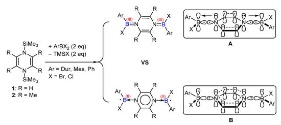 Mashima et al. reported a class of electron-rich organosilicon compounds 1, 2, and 12, which can serve as versatile reducing reagents for the group 4–6 metal chloride complexes. The corresponding low-valent metal species were prepared in a salt-free manner [27,28,29,30,31,32,33]. The reducing power mainly derives from the aromatization of the central 1,4-diaza-2,5-cyclohexadiene ring. Deeply inspired by the advantage of the salt-free reduction protocol and easy workup, we decided to examine the ability of the organosilicon compounds 1, 2, and 12 for the reduction of trivalent dihaloboranes. Based on the published results, the disubstituted compounds ArXB(N2C4R4)BXAr are proposed as the reduction products. We hypothesized two possible bonding modes (i.e., A and B in Scheme 1) between the C4N2 ring and the boron atoms. In the first manner, B–N is bound by an electron-precise σ bond (A, Scheme 1) and an additional N―B dative π bond. In the second manner, two nitrogen atoms each provide a π-electron for 6π-aromatization, while the remaining two valence electrons form a lone pair on each N atom, donating to the empty sp2-hybridized orbital of boron, thus leading to the divalent boron radical centers (B, Scheme 1).