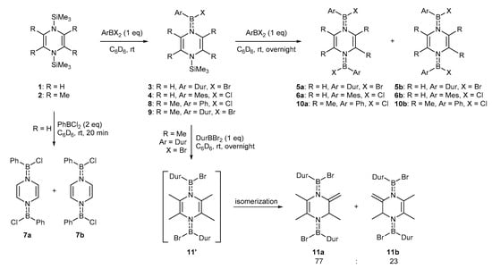 Compound 2, which features a less-negative redox potential (+0.10 V) with respect to 1 (−0.24 V), was further examined to reduce PhBCl2 and DurBBr2 (Scheme 2). Differing from the aforementioned reactions with 1, both monosubstituted products 8 and 9 could be prepared upon a 1:1 ratio reaction of 2 with PhBCl2 and DurBBr2, respectively. Upon the reaction of 2 with two equiv. of PhBCl2 at RT, the disubstituted compounds 10a and 10b were obtained as 1:1 cis-trans isomers. Surprisingly, treatment of 2 with two equiv. of DurBBr2 at ambient temperature led to the formation of 11, which can be regarded as the product from an isomerization of 11′ [36,37]. Compounds 8–11 were confirmed by NMR spectroscopic (Figures S16–S28) and HRMS studies. There were two sets (intensity ratio of ca. 1:0.3) of 1H signals between 4 and 6 ppm, each consisting of three multiplets with the integration ratio of 1:1:1, which can be assigned to the migrated H and two remaining olefinic protons. These are the most characteristic signs for the formation of the isomerized product. After assigning each peak (with the help of the NOE spectrum, see the ESI Figure S26 for more details), we could determine that the ratio of isomers 11a and 11b was 77:23. Furthermore, the isomerization was also observed upon the treatment of the isolated 9 with an equimolar amount of DurBBr2 at RT.