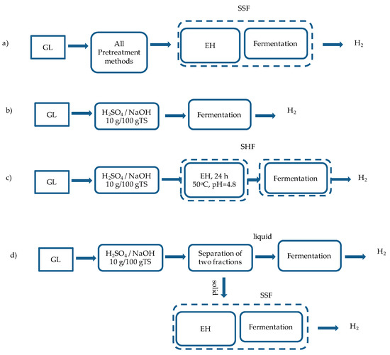 For GL pretreated with H2SO4 and NaOH at a concentration of 10 g/100 g TS, which exhibited higher hydrogen yields, BHP experiments were performed under different hydrolysis and fermentation schemes (Figure 2), and the main results are presented in Table 3. Thus, the whole pretreatment slurry was used directly for fermentation in BHP experiments, without the addition of enzymes (Figure 2b), or in an SHF scheme (Figure 2c). In addition, the liquid fraction (hydrolysate) was used for BHP without enzyme addition, whereas the solid fraction was used in an SSF concept (Figure 2d).
