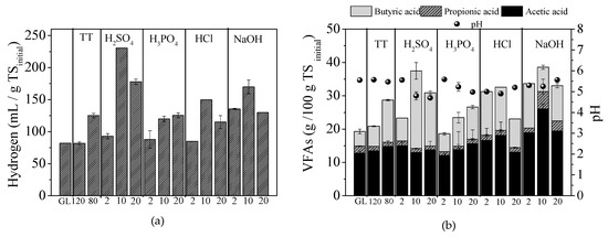 In Figure 3a, the hydrogen yield of untreated GL and that of thermally treated (80 or 120 °C) or pretreated with acids (H2SO4, H3PO4 and HCl) and NaOH at the concentrations of 2, 10 and 20 g/100 g TS, are presented, while pH and the main volatile fatty acids (VFAs) produced (acetic, propionic, butyric acid), at the end of BHP experiments, are presented in Figure 3b. It is obvious that almost all pretreatment methods applied in this study enhanced hydrogen production from GL, under SSF. Pretreatment with 10 g H2SO4/100 g TS led to the highest BHP yield, which was 230.7 ± 1.6 mL/g TSinitial or 276.8 mL/g VSinitial (VSinitial: volatile solids of initial biomass) of GL. This yield was 2.82 times higher than the respective one of raw GL (untreated) under SSF using 40 FPU cellulase/g TS and 20 times higher than for raw GL without enzymes addition. Pretreatments with 20 g H2SO4/100 g TS and 10 g NaOH /100 g TS also exhibited high BHP yields, which were 177.9 ± 4.1 mL/g TSinitial and 170.0 ± 10.7 mL/g TSinitial, respectively. HCl, NaOH and H2SO4, at a concentration of 10 g/100 g TS, led to higher BHP yields compared to the other concentrations (2 and 20 g/100 g TS for each chemical agent). In addition, the BHP of thermal treatment at 80 °C for 24 h was higher than the respective at 120 °C for 1 h, indicating that the higher treatment time had a positive effect on hydrogen production. It should be mentioned that, despite the fact that the sugars content after pretreatment with HCl at concentrations of 10 or 20 g/100 g TS were higher compared to those of 10 H2SO4 g/100 g TS, the corresponding BHP yields were lower for both cases. This could be attributed to the higher concentrations of 5-HMF and furfural, as well as of formic and acetic acids, which were released (Figure 1a) under the latter conditions. Although furans were also released in the whole pretreatment slurry for 10 g H2SO4/100 g TS (0.08 ± 0.00 g/100 g TS furfural and 0.24 ± 0.00 g/100 g TS 5-HMF), their presence did not influence the BHP (which was the highest), implying that mixed acidogenic cultures might tolerate these compounds up to this level, in agreement with other studies [2,33].