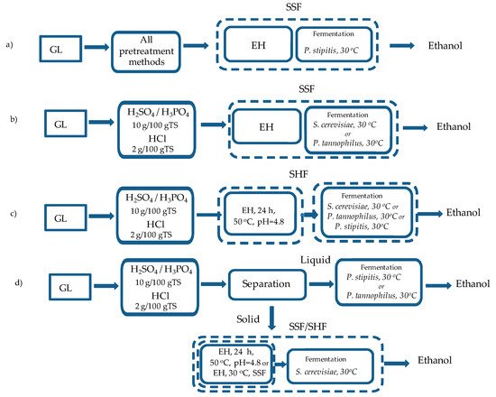 Different process schemes which were evaluated for bioethanol production (BP) of GL (EH: enzymatic hydrolysis). (a) the whole slurry of all thermo-chemical pretreatments was used for BP using Pichia stipitis in SSF (simultaneous saccharification and fermentation) mode. The whole slurry of pretreatment with H2SO4 and H3PO4, 10 g/100 g TS and HCl, 20 g/100 g TS was used for BP (b) using P. stipitis, Pachysolen tannophilus and Saccharomyces cerevisiae in SSF (c) or at separate hydrolysis and fermentation (SHF), (d) or separated and the liquid fraction was used for BP using P. stipitis/P. tannophilus, whereas the solid fraction was fermented by S. cerevisiae in SSF or SHF concept.
