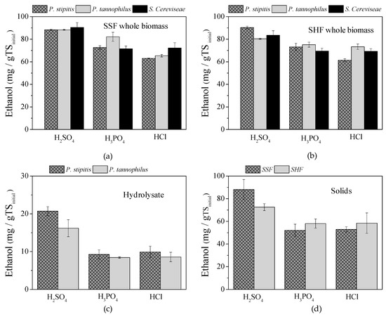 Apart from P. stipitis, S. cerevisiae or the C5 yeast P. tannophilus were used under SSF (Figure 4b) and also under SHF (Figure 4c). In addition, separation of both fractions was performed, where the rich in xylose hydrolysate was used for ethanol production from P. stipitis/P. tannophilus at 30 °C (without addition of enzymes), while the rich in cellulose solid fraction was used for ethanol production using S. cerevisiae a) in an SSF and b) in an SHF concept (Figure 4d).