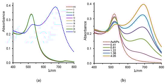 Figure 3a,b shows the spectra of gold nanoparticle dispersions in the presence of uracil and 2-thiouracil, respectively. The spectrum in the presence of 2TU was recorded at two concentration values, 9.34 and 156 µM, and no color change was observed, that is, the colloidal solution is stable over a wide range concentration of either U or 2TU. However, noticeable differences can clearly be appreciated: the λmax = 520 nm of the SPR band observed with uracil shifts to 523 nm in the presence of 2TU, which evidences the formation of sTable 2TU-capped gold nanoparticles. We have synthesized 2TU-functionalized AuNPs following a similar procedure to that of citrate capped gold nanoparticles, and recently these AuNPs were used in the colorimetric detection of uric acid [33]. Additional evidences in favor of the formation of 2TU-functionalized gold NPs are given in the next section.