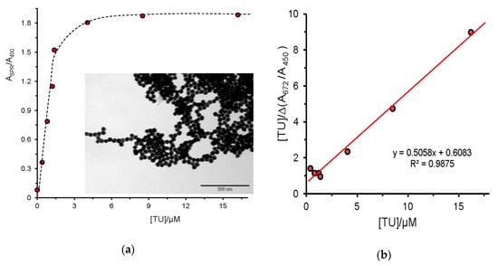 In order to quantify the interaction between thiourea (TU) and AuNPs, the modified Benesi–Hildebrand equation (double reciprocal plot or the Hanes plot in enzyme kinetics) [32] in the form of Equation (1) has been used, where Re and Ro are the absorbance ratios (A672/A450) measured at the equilibrium (AuNPs/TU) and in the absence of TU, respectively. The equation works under the experimental conditions of [TU] >> [AuNPs]. Figure 2b shows the corresponding linear plot. From the fit, the average value of Kb was (8.3 ± 0.4) × 105 M−1, which corresponds to an apparent free energy value of TU chemisorption of ∆G° = −33.8 kJ·mol−1; in addition, the slope of the corresponding plot yields a value of Re = 1.977, which agrees with the experimental value. It is important to note that the λmax shift due to the presence of TU is due to two inherent processes, thiourea adsorption over the gold surface and nanoparticles aggregation; then, the obtained binding free energy corresponds to the sum of both closely related processes and, consequently, one must refer to apparent free energy.
