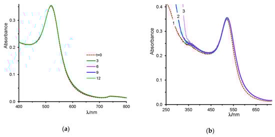 Figure 3. Spectrum of AuNPs solution (dashed line) in the presence of (a) 0.196 mM uracil recorded over 12 min at 3 min intervals, and of (b) 9.34 µM 2-thiouracil (curve 2 repeated for six cycles at 3.5 min intervals) and 156 µM (curve 3, which matches curve 2 above 450 nm).