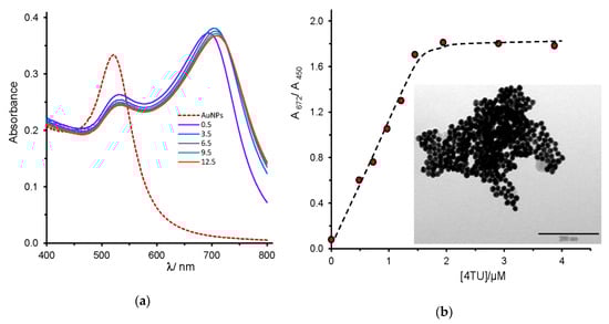 Following the same approach as with thiourea, the fit process of the absorbance ratio values (A672/A450), determined as a function of 4TU concentration, to Equation (1) gives an average value of the binding constant of 4TU over the gold surface Kb = (11.1 ± 1.5) × 105 M−1, that is, comparable to the binding constant obtained for thiourea, a fact that indicates the same binding mode as S atoms to the gold surface, Scheme 2.