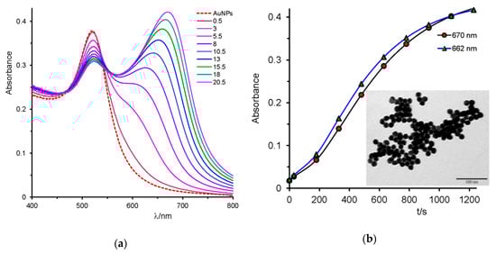 Cytosine is the uracil derivative in which the exocyclic oxygen is replaced by a primary amine group. As we have indicated in the previous section, we have not observed the aggregation of AuNPs mediated by uracil under different experimental conditions. On the contrary, cytosine strongly interacts with AuNPs. Figure 5a shows the evolution of the SPR band of AuNPs in the presence of 11.3 µM cytosine; the optical intensity at 520 nm slightly decreases, whereas a new plasmon band at higher wavelength increased exponentially with time. The corresponding absorbance readings at 662 or 670 nm are plotted in Figure 5b as a function of time. Good first-order kinetics were observed (the first two points taken in the absence of cytosine and at 20 s after the addition of cytosine were not included). The rate constant for the assembly process was determined as k = (2.0 ± 0.1) × 10−3 s−1 at [C] = 11.3 µM and k = (1.90 ± 0.04) × 10−3 s−1 at [C] = 5.75 µM; nevertheless, the millimolar cytosine concentration causes reactions too fast to follow by conventional methods. The presence of small quantities of acetic acid accelerates the assembly process, e.g., k = (3.75 ± 0.02) × 10−3 s−1 at [C] = 9.5 µM and [acetic acid] = 4.2 mM. In mild acid medium, cytosine may be protonated on N(3) to yield the corresponding cation (pKa1 = 4.4), which favors the interaction with the negatively charged citrate-capped gold nanoparticles.