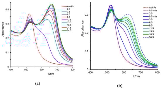 Finally, Figure 6a,b shows the representative spectra monitoring the evolution of the SPR band of gold nanoparticles upon the addition of either 1.55 µM adenine or 8.4 µM guanine, respectively. The surface plasmon resonance band of gold NPs shifts to longer wavelengths due to the aggregation of AuNPs, with maxima at 663 or 620 nm in the presence of adenine or guanine, respectively. The H-bonding interactions between the DNA bases adsorbed to the gold surface of adjacent nanoparticles and possible π−π and hydrophobic interactions can essentially decrease the interparticle distance and induce color change due to aggregation. The rate of the nanoparticle assembly process increases with the nucleobase concentration; the presence of a small concentration of either acetic acid or Mn+2 ions, under conditions of stable AuNPs, accelerates the process [21]. The increase of adenine concentration favors interparticle interactions and the aggregation process is faster (Figure S5a). The process follows first-order kinetics, with the rate constant determined for [A] = 1.55 µM as k = (2.60 ± 0.03) × 10−3 s−1, whereas with [A] = 38.8 µM, it increases to k = (5.75 ± 0.01) × 10−3 s−1, and in mild acid medium of 1.6 mM acetic acid, the process is too fast to monitor by conventional techniques.