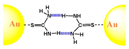 The large red-shift of the SPR band induced by TU is due to AuNPs assembly, as it is shown in the corresponding TEM microgram of the insert of Figure 2a. The sulfur of TU tends to really bind to the surface of colloidal gold particles via chemisorption-type interactions; at the same time, the amine groups of TU molecule from one NP can form H-bonds with the same group of an adjacent NP. Thus, the H-bonding network can act as cross-linking agent for pairs of TU-coated AuNPs, thereby inducing their aggregation. Scheme 2 illustrates the process.