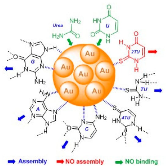The properties of AuNPs are characterized not only by the properties of the metal cluster core, but also by those of the organic molecules that constitute the monolayer and contribute to cluster stabilization. In this sense, the plasmon frequency is sensitive not only to the nature of the capped gold molecules that determines its microenvironment, but also to the size of nanoparticles (NPs) [22]. Upon reduction of the interparticle distance, the SPR band can couple, and red-shift in the absorption spectrum is observed. Surface modifications of gold NPs using functionalized capping molecules has been exploited in the development of new diagnostic tools for biological compounds. DNA bases are the fundamental constituents of nucleic acids containing nitrogen found within nucleotides. The nucleic acids are the most studied biomolecules for capping gold NPs, and have been used with different goals that include the colorimetric detection of duplex and triplex DNA-binding molecules [2,6], DNA methylation as an early sign of tumor cells [6], or in gold nanoparticle-assisted cancer treatment [7,8].