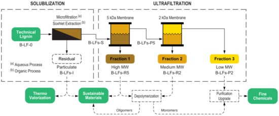 The organic process fractionation comprised a Soxhlet extraction followed by a two-membrane cascade ultrafiltration (shown in Figure 1 as part of an idealized lignin valorization scheme) and a final fraction recovery step, as described below (see also the results and discussion section).