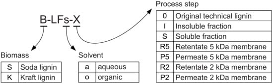 Because of the relevant number of different fractions handled, in Figure 1 and throughout the present work a labelling scheme for the working lignin fractions was adopted, allowing a quick identification of the related biomass, solvent, and process step (Figure 2).