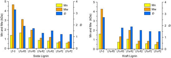 Both FC assay and 31P-NMR data indicated a slight increase in phenolic hydroxyl groups in the lower molecular weight fractions B-LFa/o-R2 and B-LFa/o-P2. A similar trend was also reported from 31P-NMR analysis on aliphatic hydroxyl and carboxyl groups, in agreement with recent works on analogous technical lignins [,,]. These results have great interest in terms of further selection of an appropriate fraction for a specific application, where the relative abundance of the functional groups is essential for the further processing.