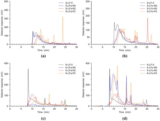 The characteristic values of the number-average molecular weight (Mn), weight-average molecular weight (Mw), and polydispersity index (Đ) are listed in Table 1 for S-LF-0 and Table 2 for K-LF-0. Analyses were performed using mono-dispersed polystyrene standards as the reference (see the materials and methods section for details).
