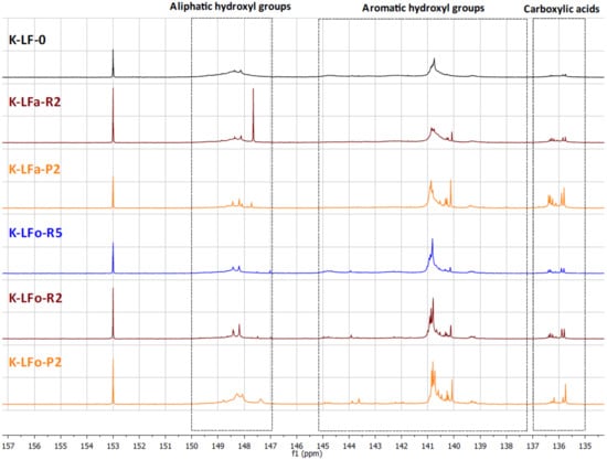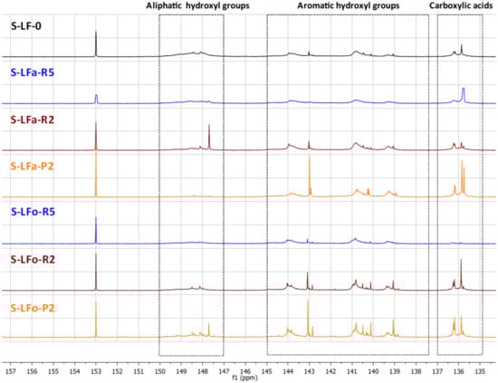 The different types of hydroxyl groups present in the starting lignins and fractionated samples were deeply investigated by 31P-NMR. The 31P-NMR spectra of the phosphitylated lignin fractions are shown with chemical shift assignments in Figure 8 and Figure 9, where the parent materials S-LF-0 and K-LF-0 are also shown for easy comparison. In detail, the following spectral regions were integrated to acquire the information about the chemical nature of the different hydroxyl groups: 150–147 ppm for the signals associated with aliphatic hydroxyl groups, and 145–138 ppm for the signals associated with aromatic hydroxyl groups. The signals of carboxylic acids groups were centered at 136 ppm. The peak integration in the three main portions of the spectrum led to the quantification of the total hydroxyl groups expressed in mmol of functional groups per gram of dry compound, as reported in Table 7 and Table 8 for S-LF-0 and K-LF-0, respectively.