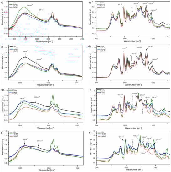 FT-IR spectra of soda (a,b,c,d) and kraft (e,f,g,h) lignin fractions recovered from the aqueous process (a,b,e,f) and the organic process (c,d,g,h). Different regions of the infrared spectrum are reported for clarity.