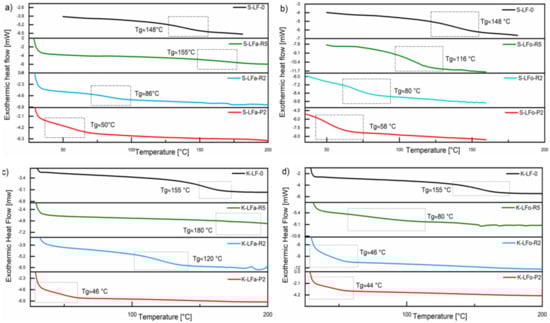 The thermal transitions in all lignin fractions, in particular the glass transition temperature (Tg), were evaluated by means of DSC analysis and compared with the pristine samples S-LF-0 and K-LF-0. DSC traces of both soda and kraft lignin fraction systems are presented in Figure 11. As it can be seen in the plots, in the case of organic solvent fractionation, the solvent extraction step led to a decrease in Tg of all the recovered materials, with samples S-LFo-P2 (Tg = 58 °C) and K-LFo-P2 (Tg = 44 °C) showing the lowest values, in accordance with the trends observed on molecular weights in the GPC results and in line with what was recently reported on analogous systems [,]. In the case of aqueous fractionation, a similar trend was observed on S-LFa-P2 and K-LFa-P2, with comparable values of Tg (Tg = 50 °C and 46 °C for S-LFa-P2 and K-LFa-P2, respectively). Sample S-LFa-R5 showed a slightly higher Tg than the parent sample S-LF-0, likely due to the slightly higher value of Mn observed for this fraction in GPC measurements. Similarly, the Tg of sample K-LFa-R5 was not easily detectable from the DSC trace but was higher (Tg = 180 °C) than the corresponding parent material K-LF-0 (Tg = 155 °C), in line with the high molecular weight inferred for this fraction from GPC analysis (Table 2).