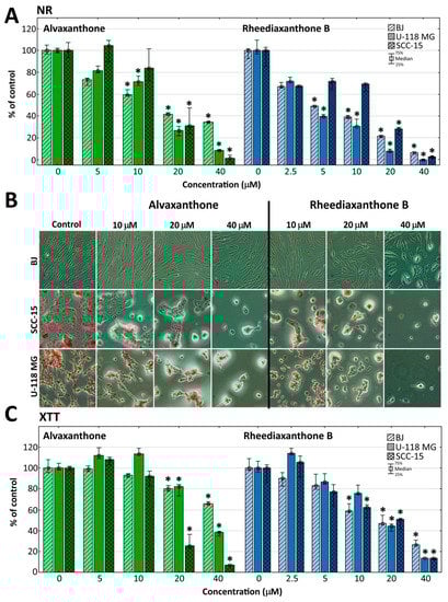 Viability of BJ, U-118 MG and SCC-15 cells after 48 h treatment with alvaxanthone or rheediaxanthone B, estimated by NR (A) and XTT (C) assays. Each bar represents the median of a population of 9 results, obtained in consequence of three independent experiments, each done in triplicate. The whiskers are the lower (25%) and upper (75%) quartile ranges. The results significantly different from control (in a view of the Kruskal–Wallis test) are marked * (p ≤ 0.05). (B) Cell morphology and neutral red accumulation following 48 h alvaxanthone or rheediaxanthone B treatment and 1 h incubation with neutral red. Red vesicles are lysosomes containing the dye.