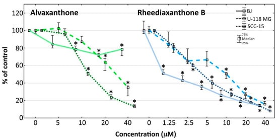 A possible cytotoxic mechanism of alvaxanthone can be hypothesized, relying in glioma and fibroblasts on cellular and lysosomal membrane disruption rather than mitochondrial function impairment, as indicated by lower viability of both U-118 MG and BJ cells observed in the NR than XTT assay at the highest alvaxanthone concentration. A different toxic pattern was observed in squamous carcinoma cells, manifested by similar cell viability levels at the whole range of alvaxanthone concentrations and equal IC50 values observed with both assays (IC50 = 17 μM), indicating both cell membrane damage and mitochondrial dysfunction. These results suggest also that alvaxanthone impact on mitochondrial metabolism was in SCC-15 cells stronger compared to the other cell lines. In accord, Hou et al. [41] showed the IC50 values estimated for human oral squamous carcinoma cells (HSC-2 cell line) and normal human gingival fibroblasts (HGF) after 24 h incubation to be almost equal (22 µM and 25 µM, respectively).