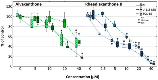 Changes of caspase-3/7 activities and intracellular ATP level in BJ, U-118 MG, and SCC-15 cells after 48-h incubation with 5–40 µM alvaxanthone or rheediaxanthone B. Median results are presented of three independent experiments, each performed in triplicate. The whiskers are lower (25%) and upper (75%) quartile ranges. The results significantly different from control (in view of the Kruskal–Wallis test) are indicated as * (p ≤ 0.05).